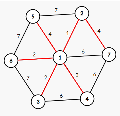 第一行先是一个正整数n (n ≤ 1000)代表图中城邦数,紧接着是一个空格以及正整数m(1≤ m ≤ 200000 代表已知魔法通道数,接下来m行每一行三个整数u,v,w用空格隔开代表城邦u和城邦v之间有一条长度为w的魔法通道,(u, v ≤ n,w ≤ 1000000),输入可能含有自环以及重边,上图为样例解释。